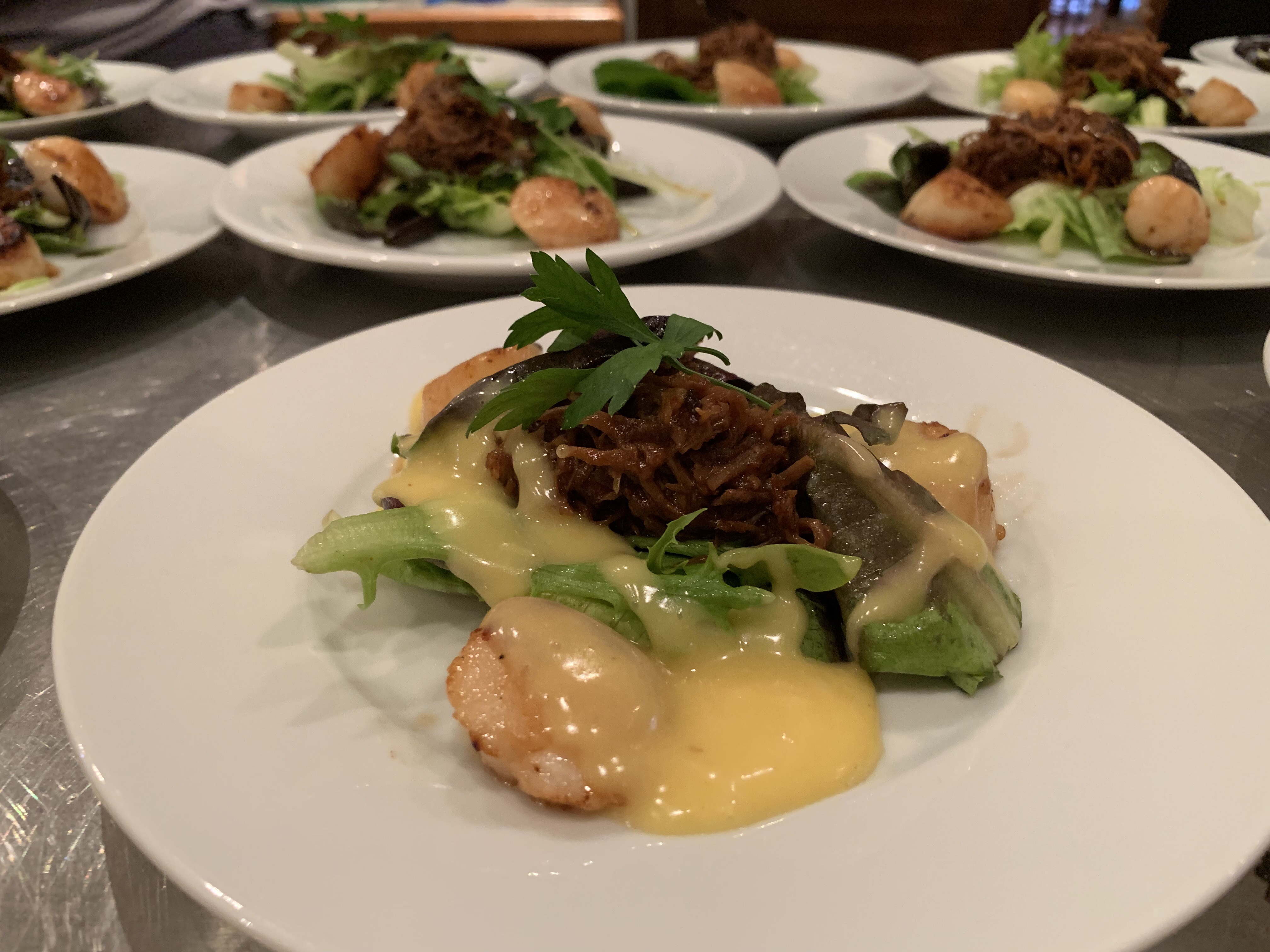 Starter - Scallops, pulled pork, hollandaise and salad with lemon vinaigrette