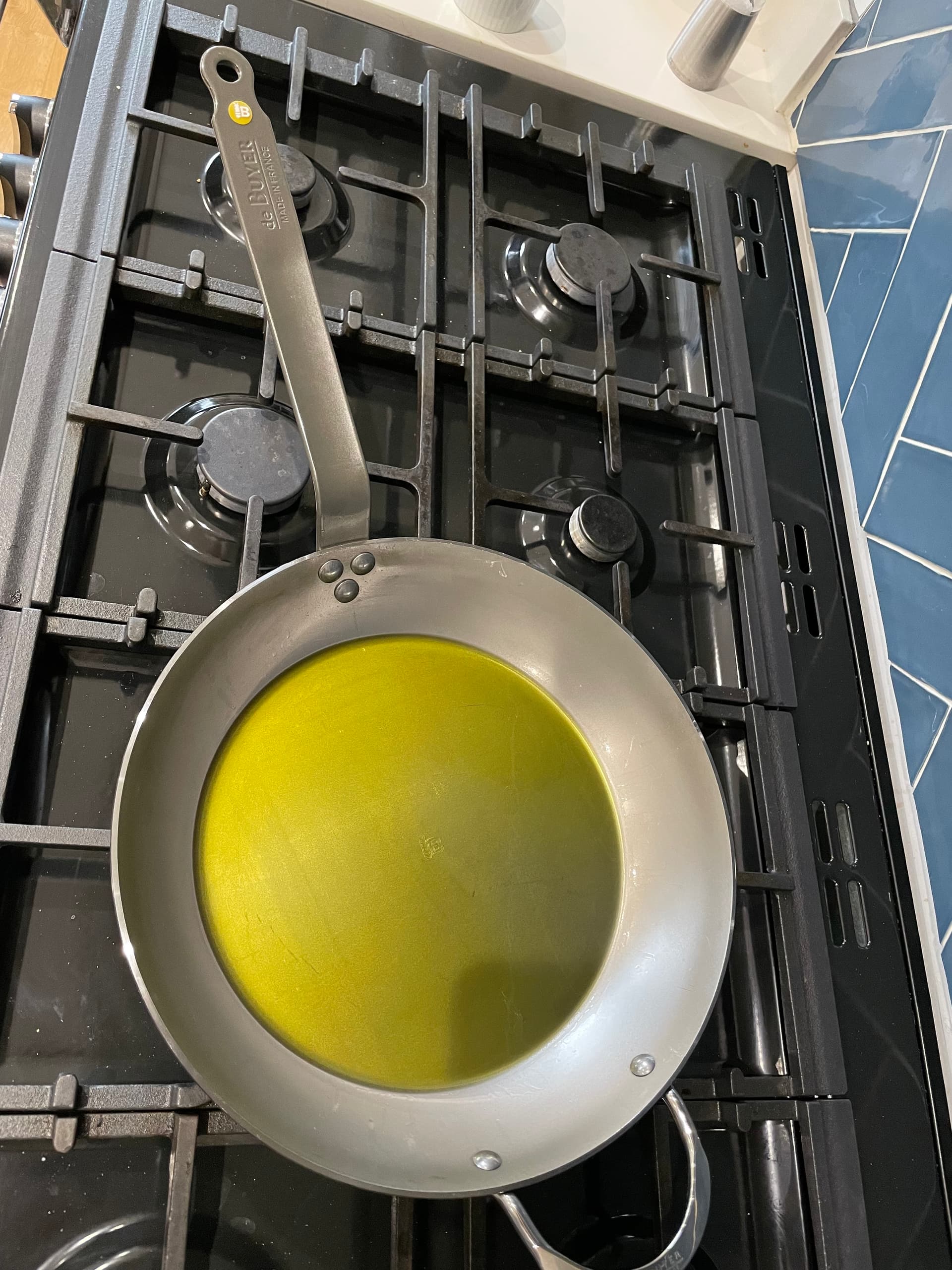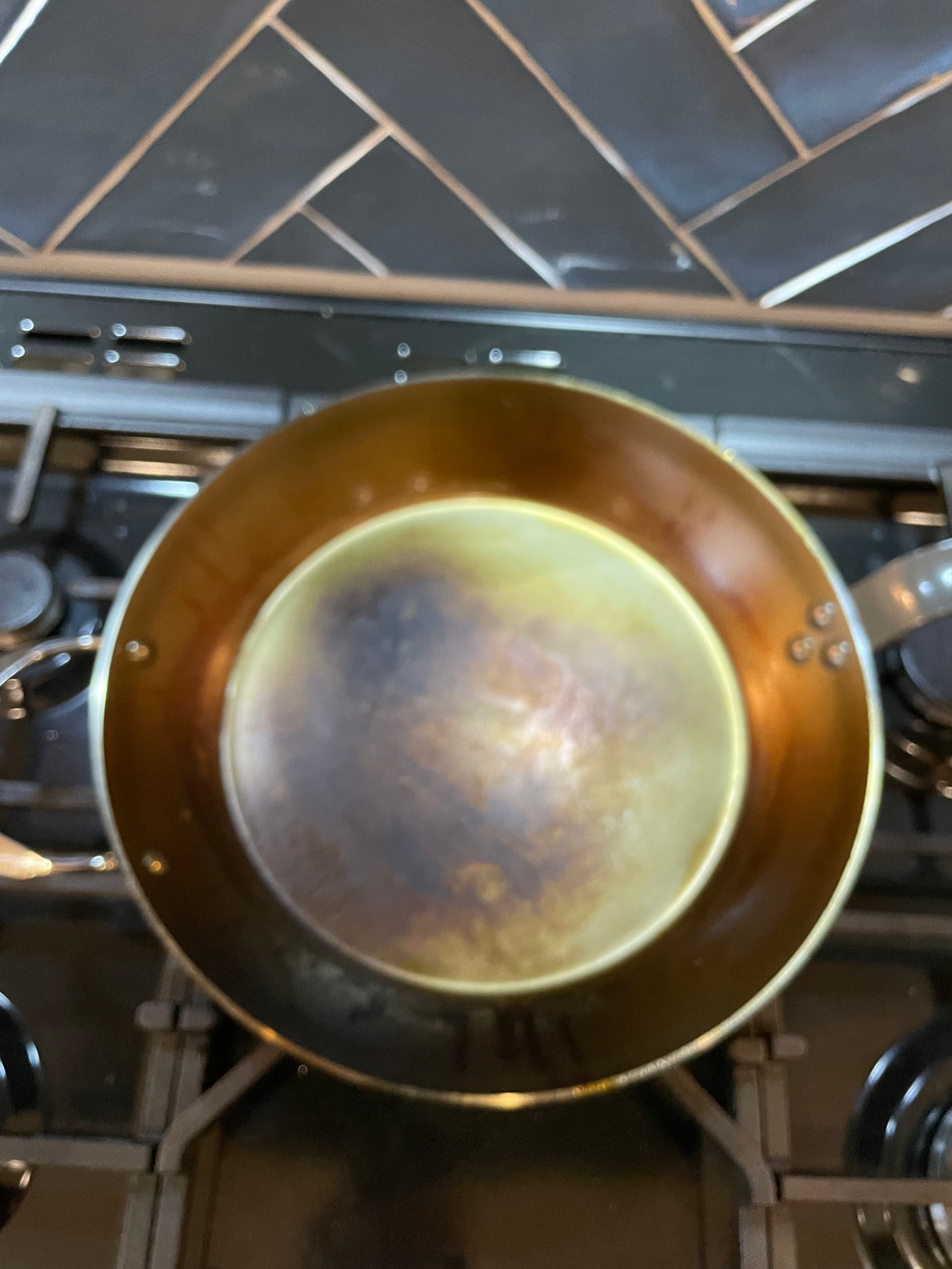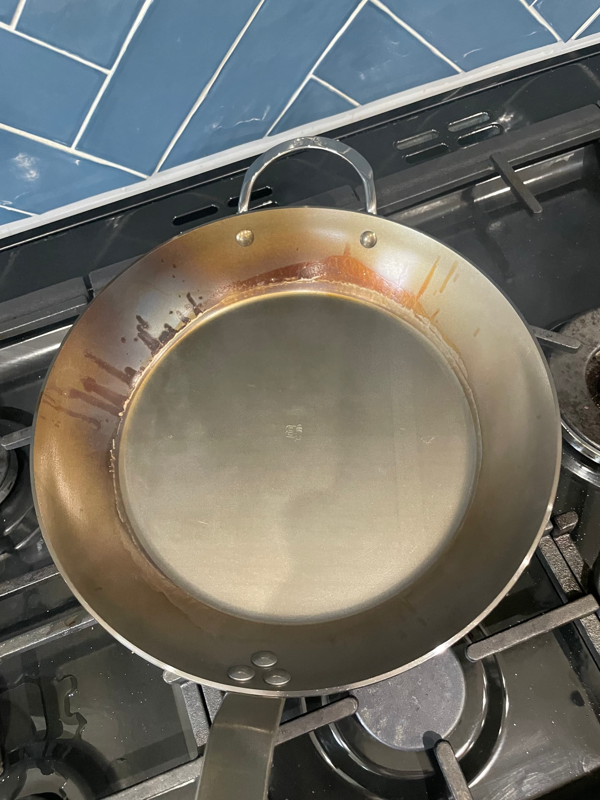 Yes I noticed that so I’ve seasoned a few more times on the hob - also rather more pertinent is this is the 32” pan and won’t quite fit in the oven. I think it’s looking better now - cooked eggs this morning - perfect. Steaks this evening.