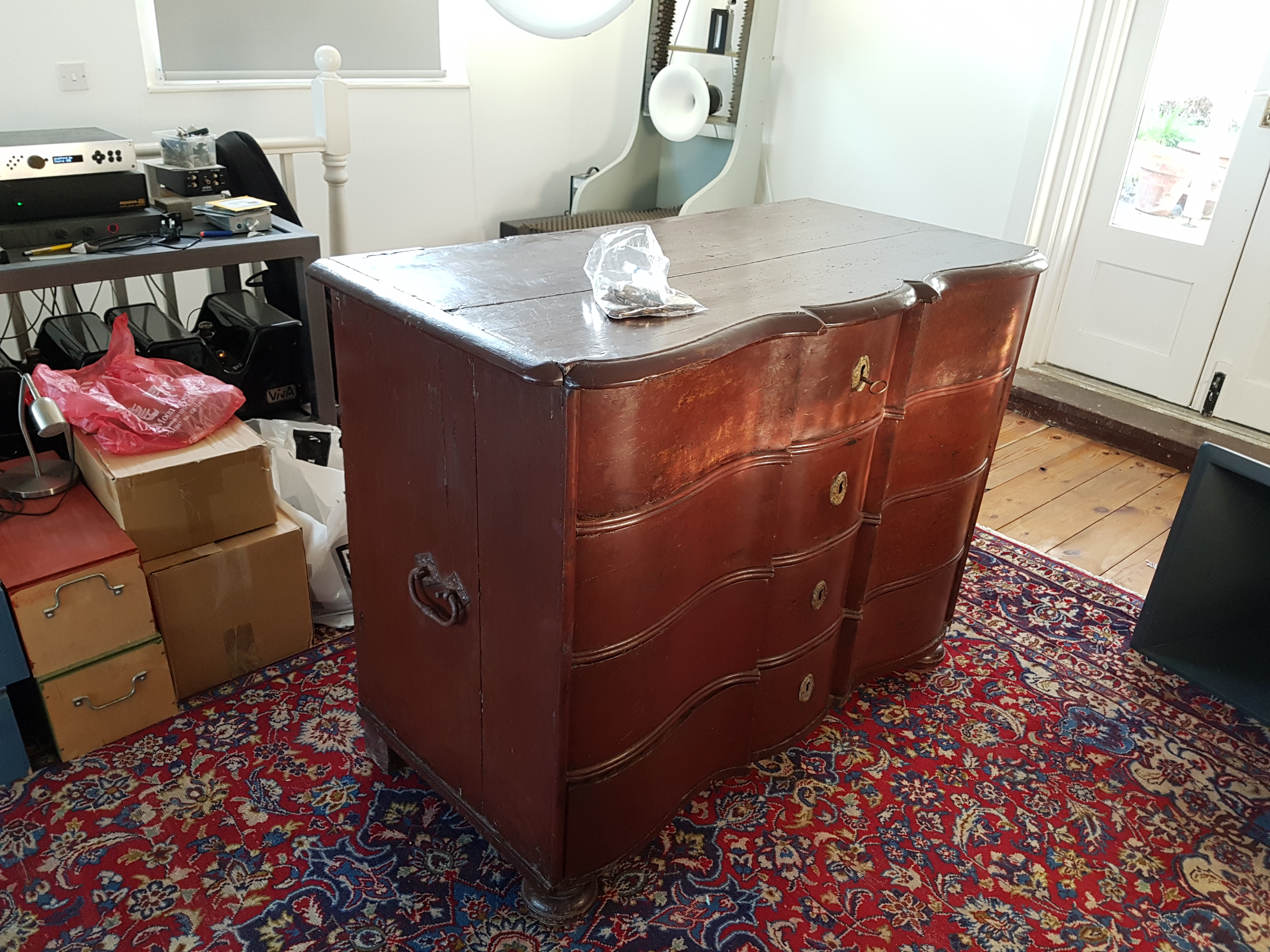 The Chest of drawers is also Danish but a hundred and fifty years older. It is dumped there while the rooms upstairs are worked on.