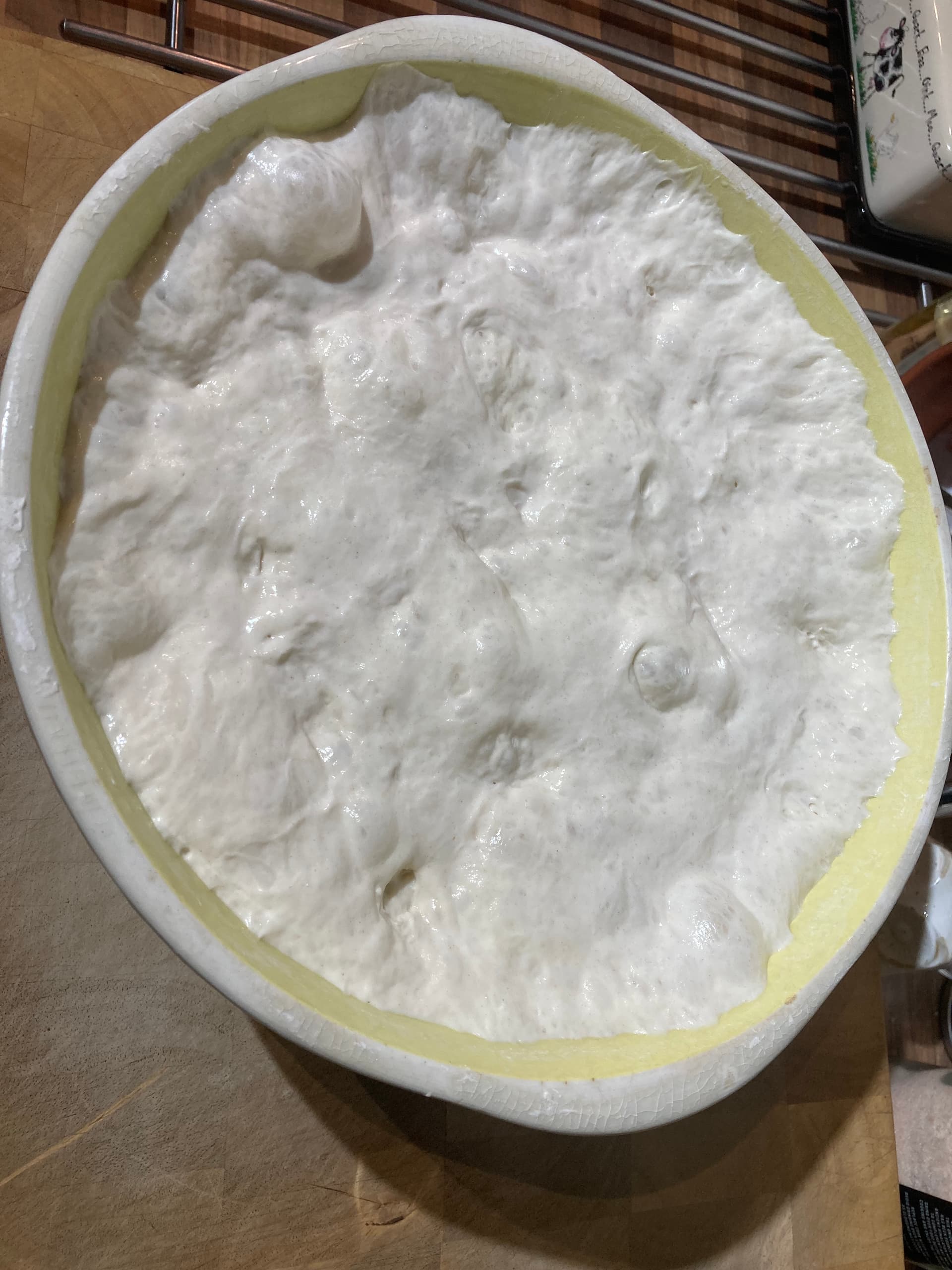 Now it will sit in the kitchen until morning. Then final folding, balling up and into the banneton which will go into the fridge for 4 hrs before scoring and into the dutch oven.