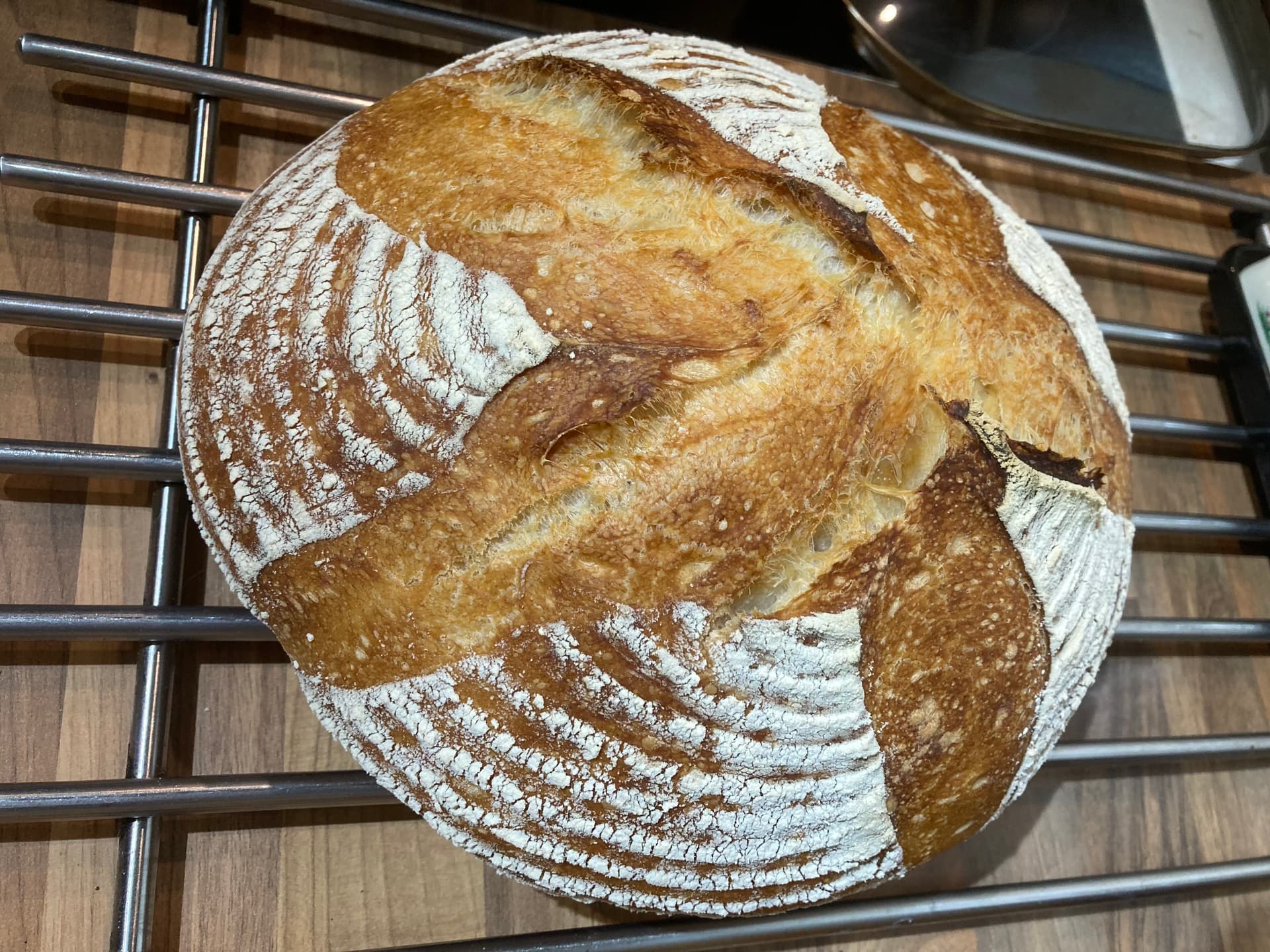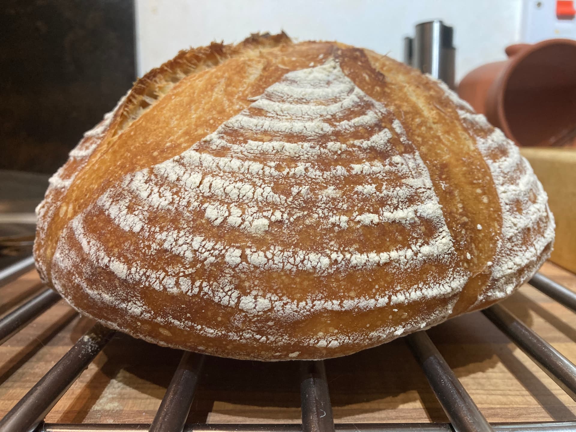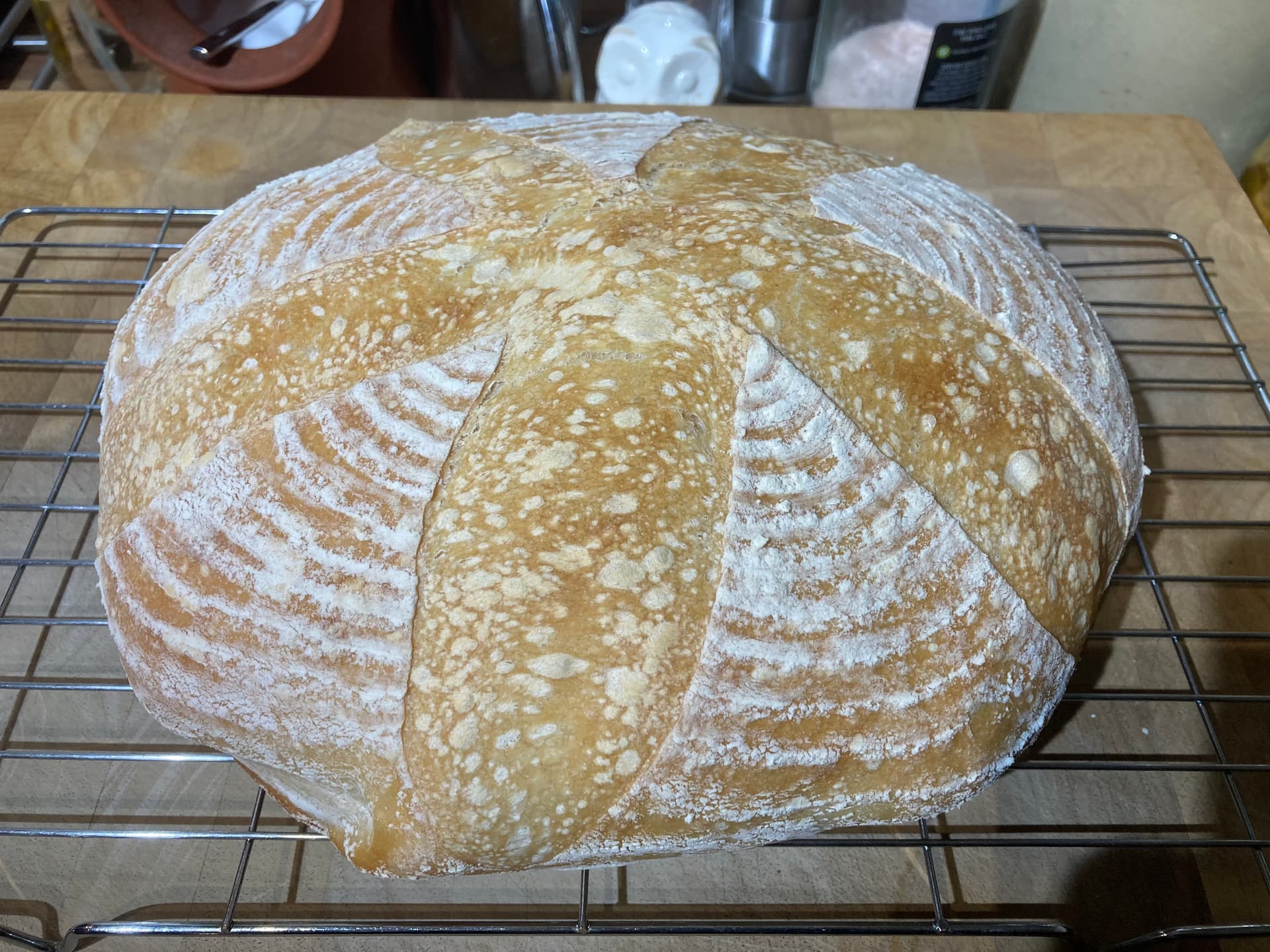 As I suspected, despite 3 1/2 hrs in the fridge, it collapsed somewhat when I took it out of the banneton. So ended up as a fairly flat loaf. It did get some oven spring which improved things slightly.