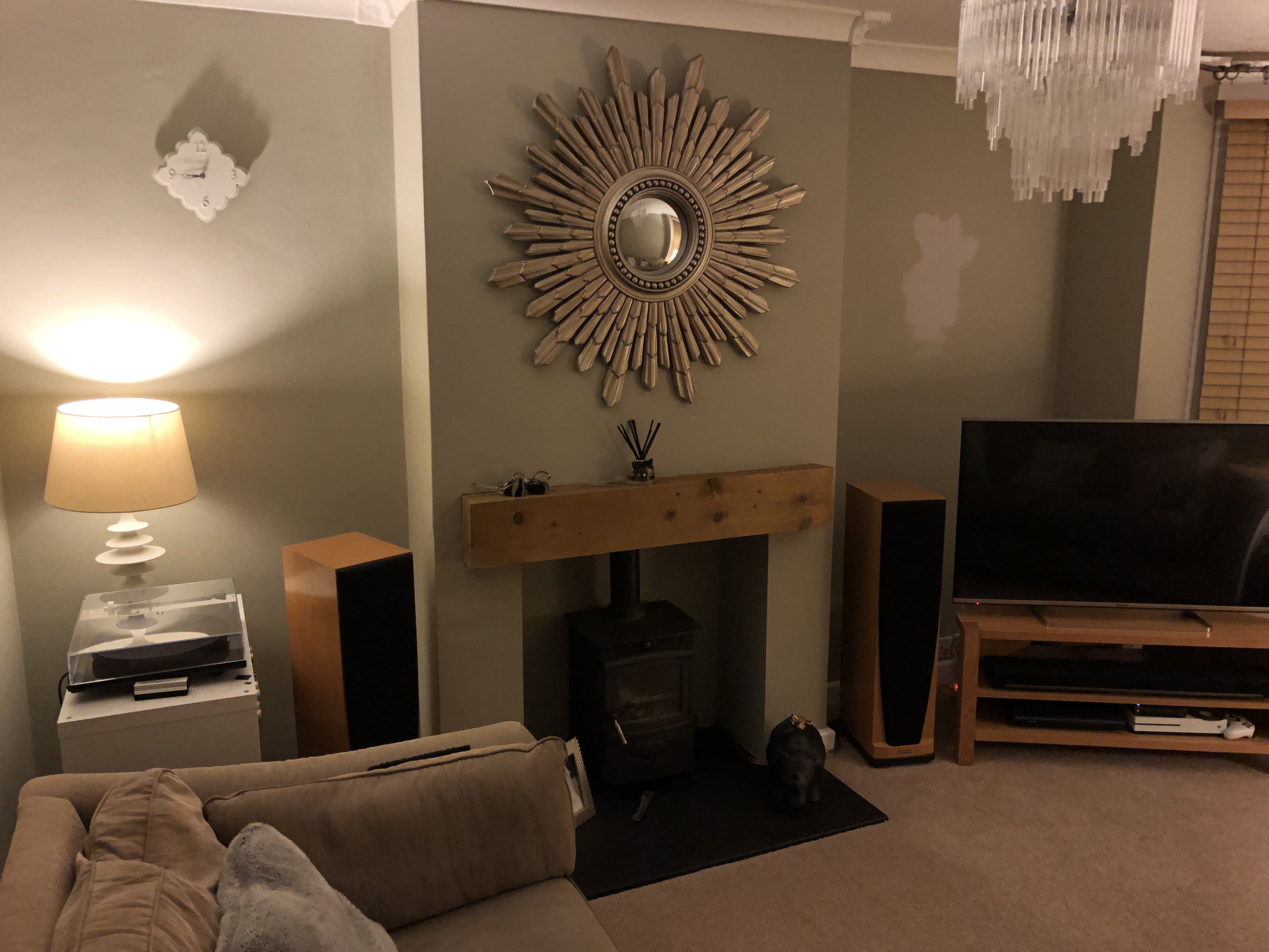 Laura Ashley mirror is tolerated for acoustic reasons. Chuffed with the log burner, not had one before but the rest will be going.