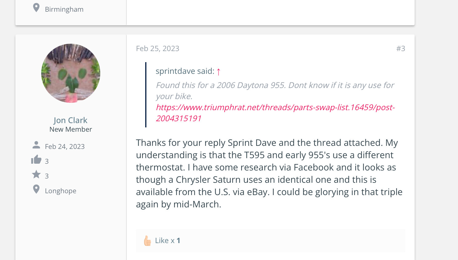 Had an overheating issue with the speed triple , thermostat is fucked but been discontinued by triumph and no pattern parts available. Currently running without one and hoping a second hand one turns up on eBay.