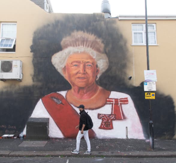 Why is a Patrick Stewart / Dean Norris mashup dressed as the queen on a mural?