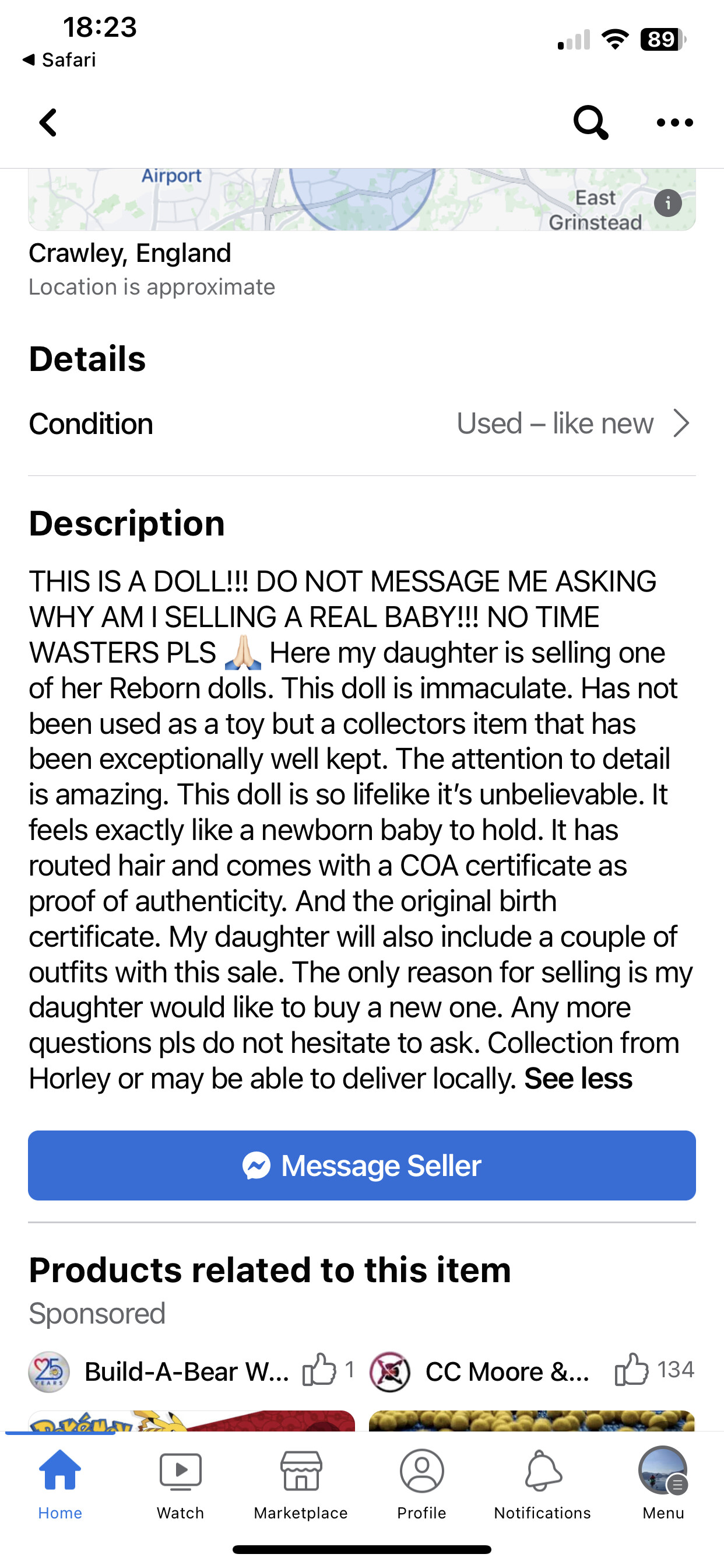 I remember a tv programme a few years back about these things. There was one woman in Iirc her 60’s who had one and treated it like a real baby, dressing it in fresh clothes every morning, pushing it around in a pram, changing it and putting it to bed etc. I think there was some kind of tragic back story like she’d lost a baby or a grandchild. When they asked her husband what he thought of it, he started saying it gives his wife some comfort, but then his patience obviously ran out and he just blurted out in front of his Mrs, “Actually, I think it’s just bloody creepy…” and the poor woman just dissolved into tears . It was quite disturbing really.