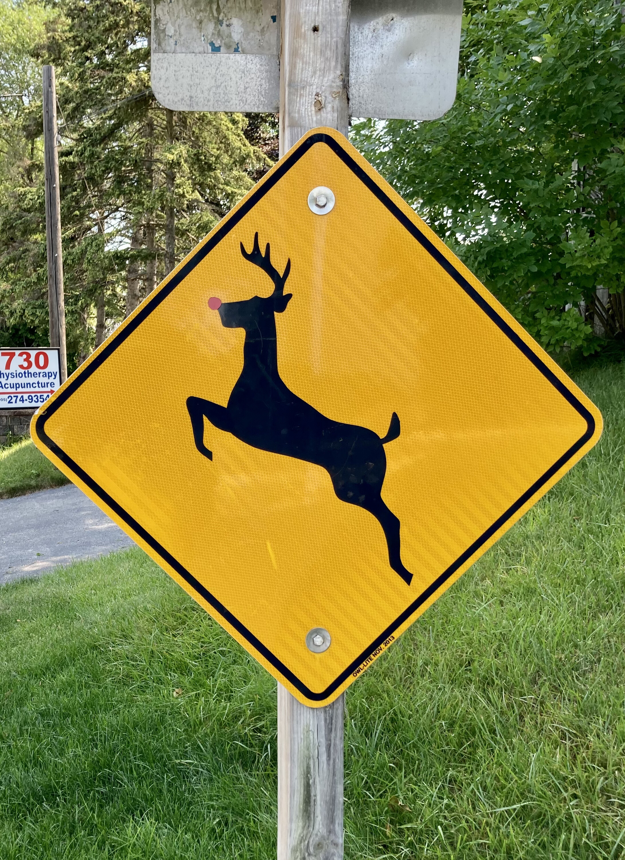 Long lived bit of graffiti. The Rudolph nose has been removed by city workers (and the sign swapped for newer) a couple of times over the years, but mostly in place since the 80s.