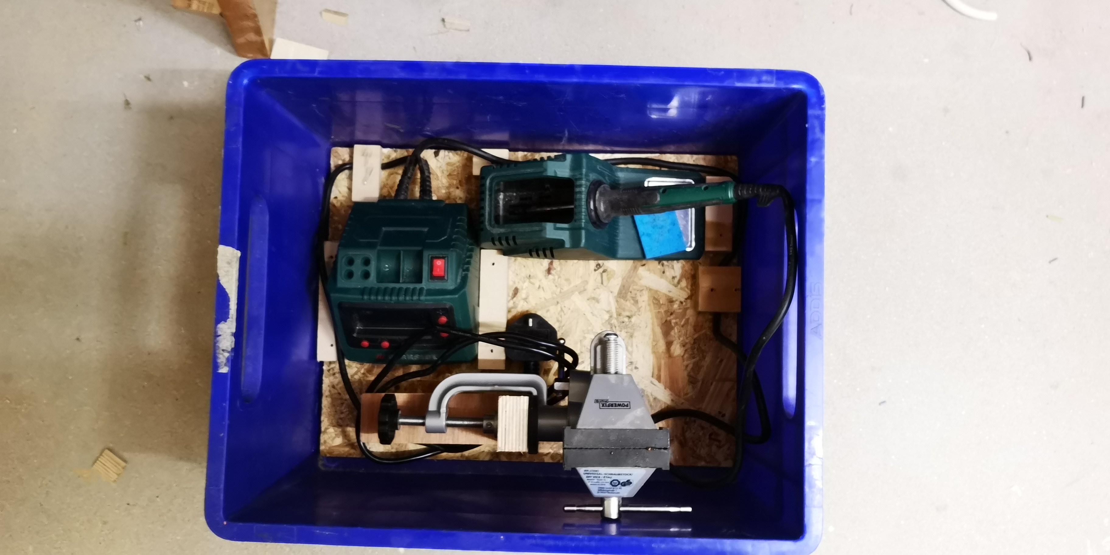 Another busy day at home bodging - I needed to do a little soldering so decided operationalise my soldering iron setup a little: The mains lead now has a place to be wrapped, there is a base for soldering on and all components are secure, plus I can fit a small vice on it. Aaand It fits in a small plastic crate when not in use so can be tidied easily.
