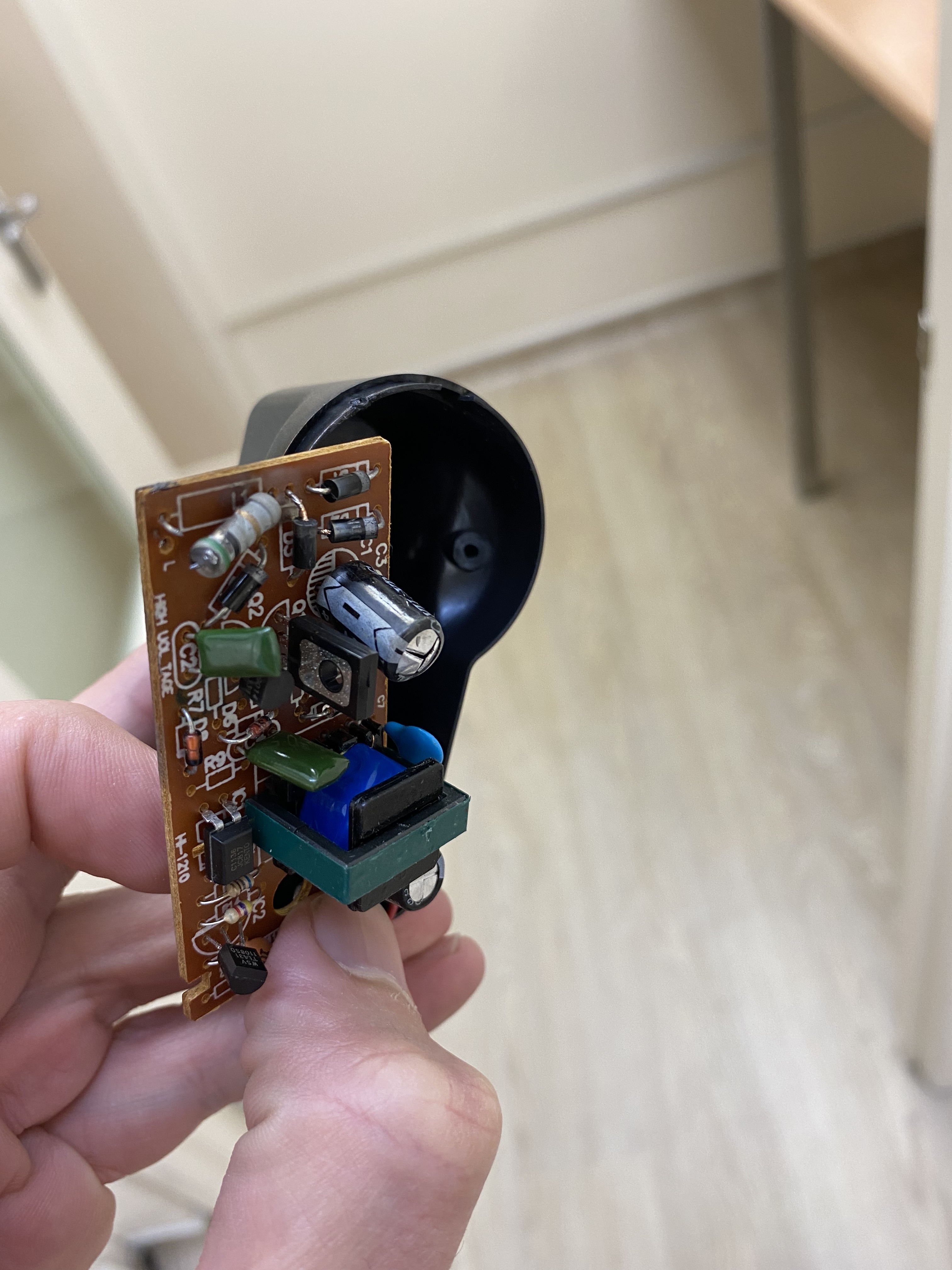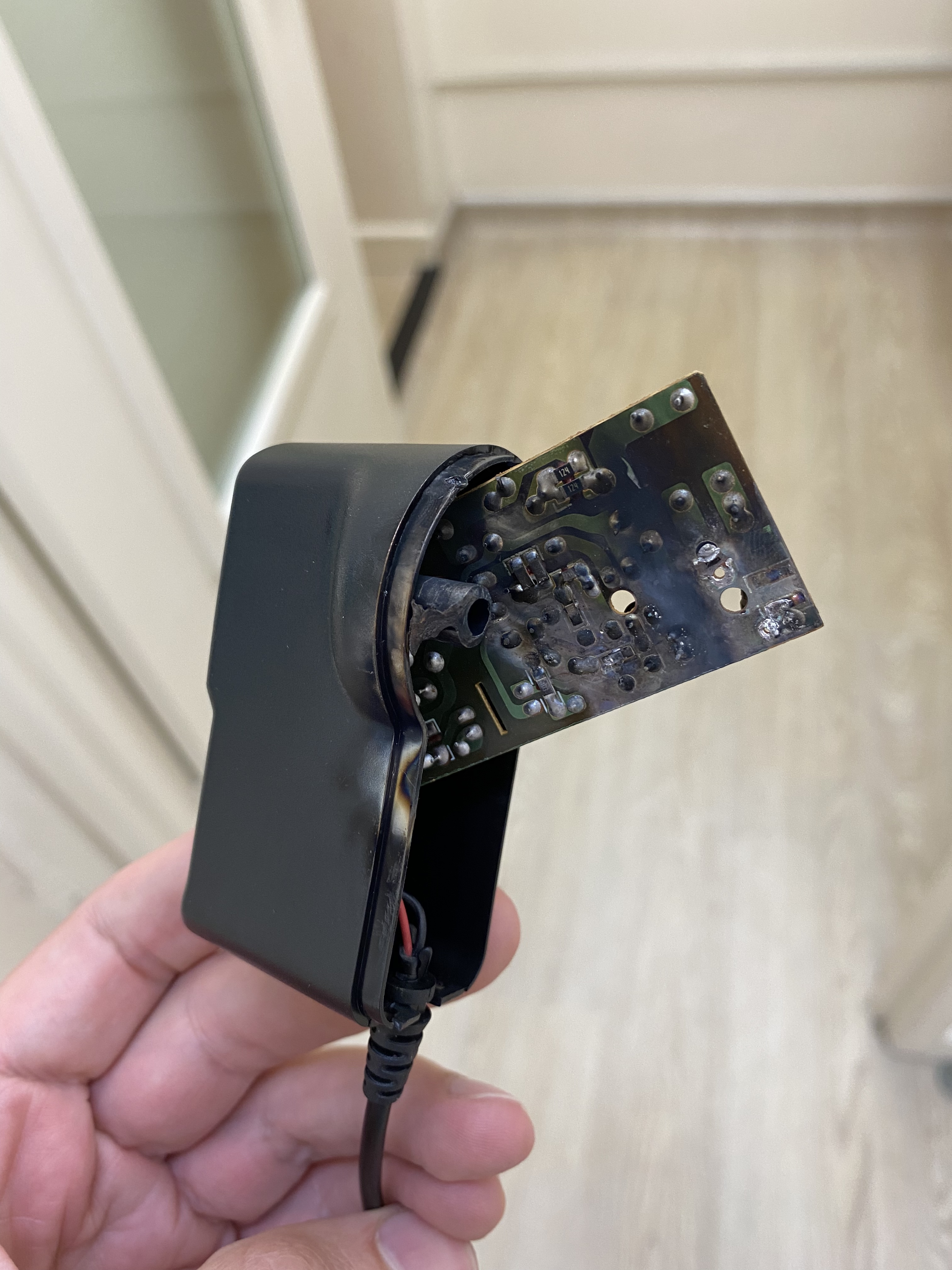 Getting hit in the back of the leg by this chinesium power brick at work. It decided to release the magic smoke with a big bang and leave the plug section in the wall and travel across the room and hit me.
