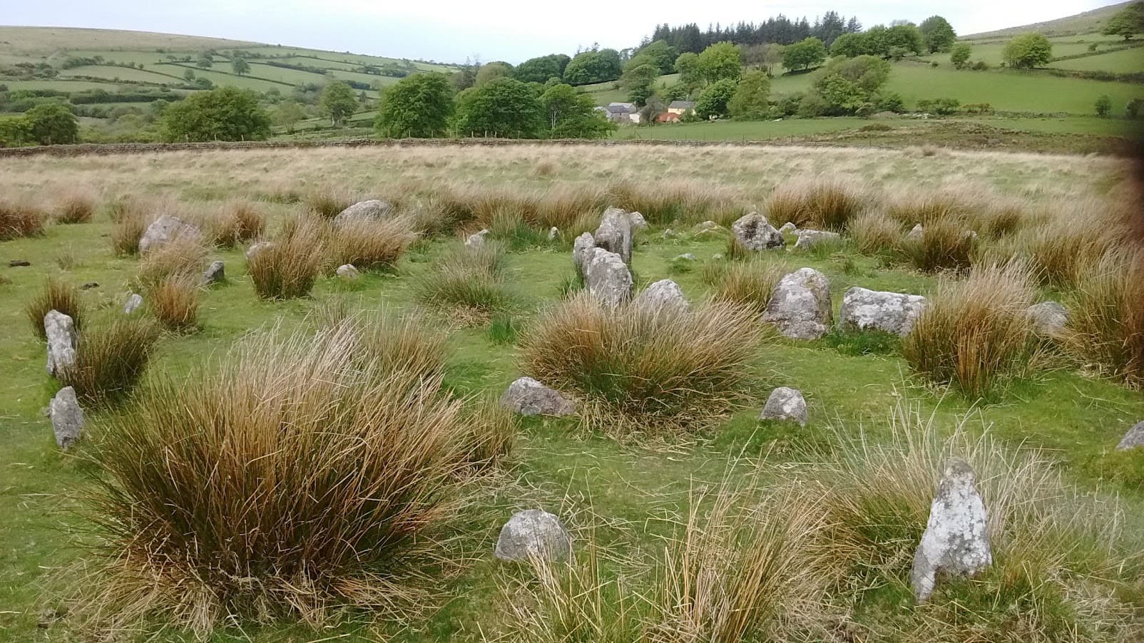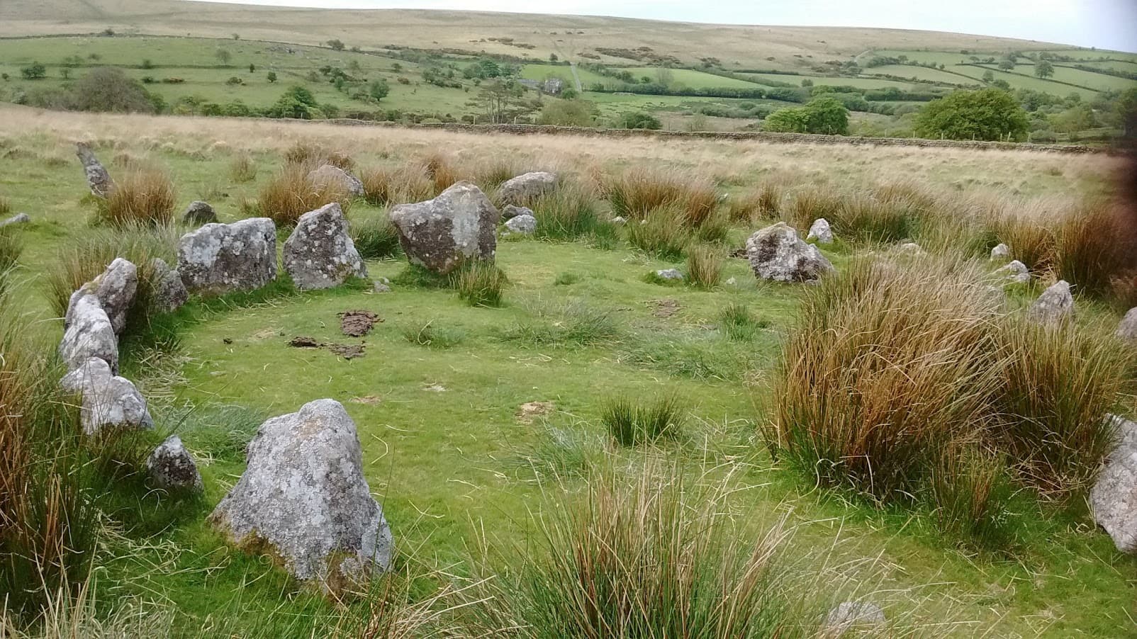 These are a curious feature, a set of 4 circles of stones dating from the Bronze age with the largest circle some 20m in diameter with stones up to maybe a meter high. There are also various stone rows in the vicinity although many have been repurposed in nearby walls & as boundary markers.