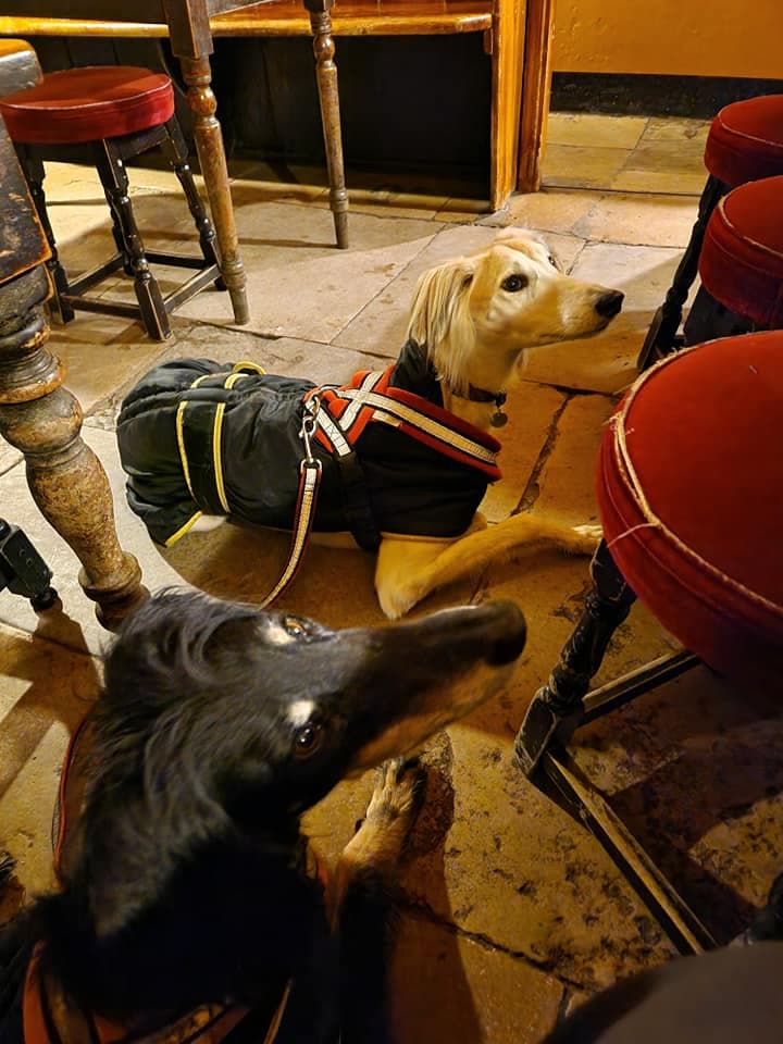 We finally got to the Square & Compass at 4pm having encountered an obstacle course worthy of the SAS due to the fact a great many field gates and stiles have been “designed” for people with small or no dogs, and not our tall, awkward, pigshit-thick lurchers, plus which a great many waymarkers have been removed - presumably by stroppy farmings.