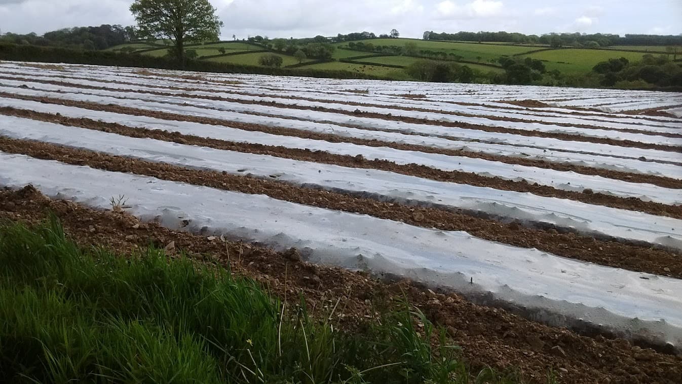 Fields planted with strips of what looks like clingfilm over the crop the early shoots of which are bursting through the film. I presume this is biodegradable because it’s a lot of plastic going into the land if not.