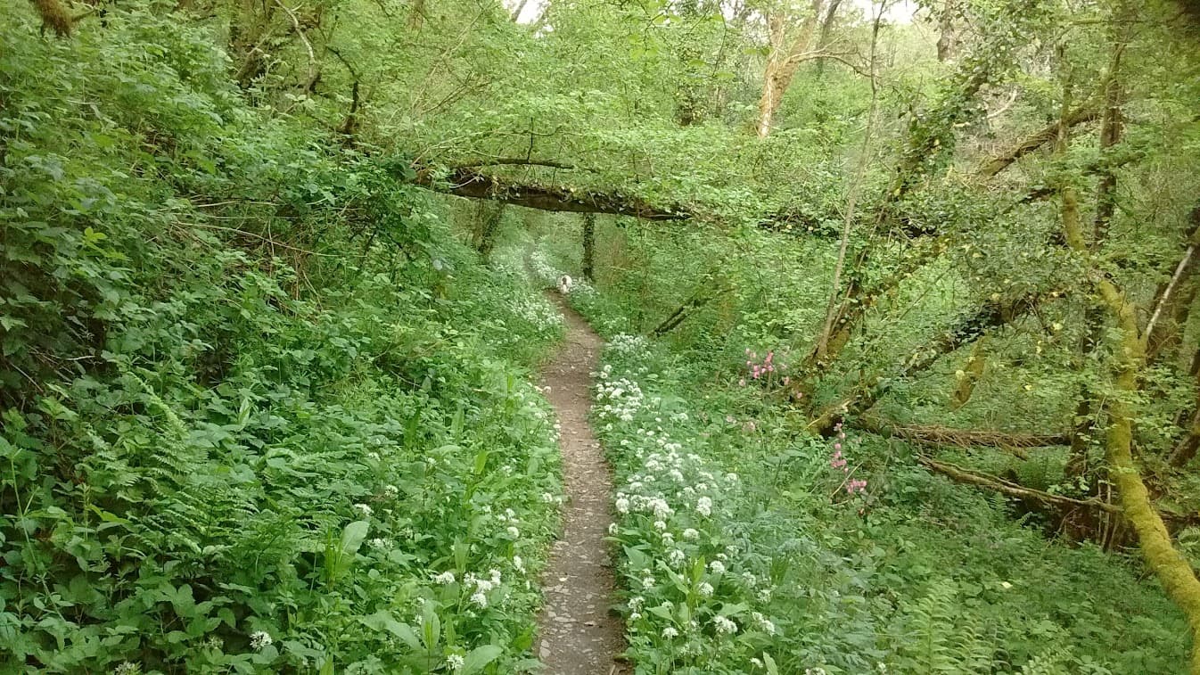 Our walk takes us down into the valley through woodland filled with flowering wild garlic.