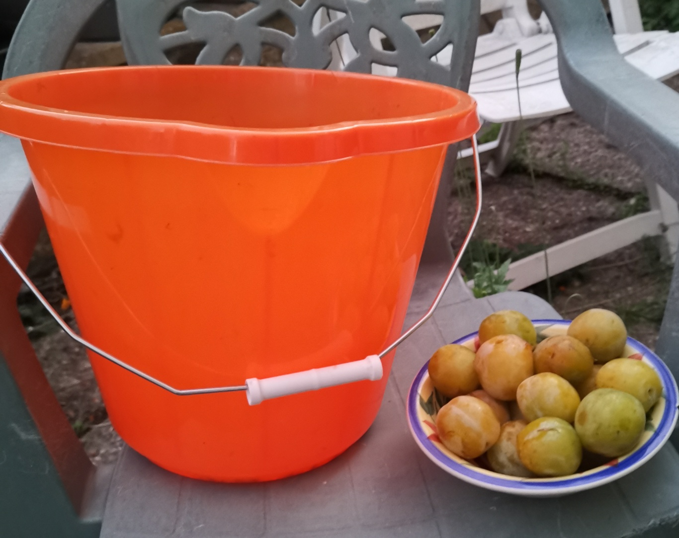 Filling this 3 gallon bucket with yellow gage plums (sample on the right)