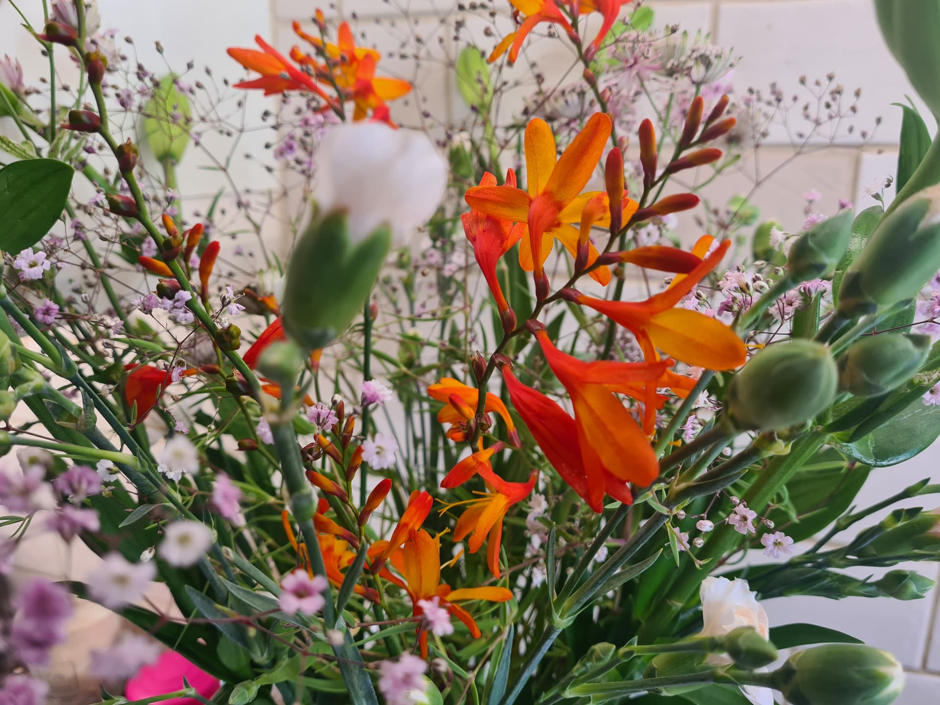 Admiring the cut flowers, many from the garden. Fuck knows what they are, but the orange ones are nice.