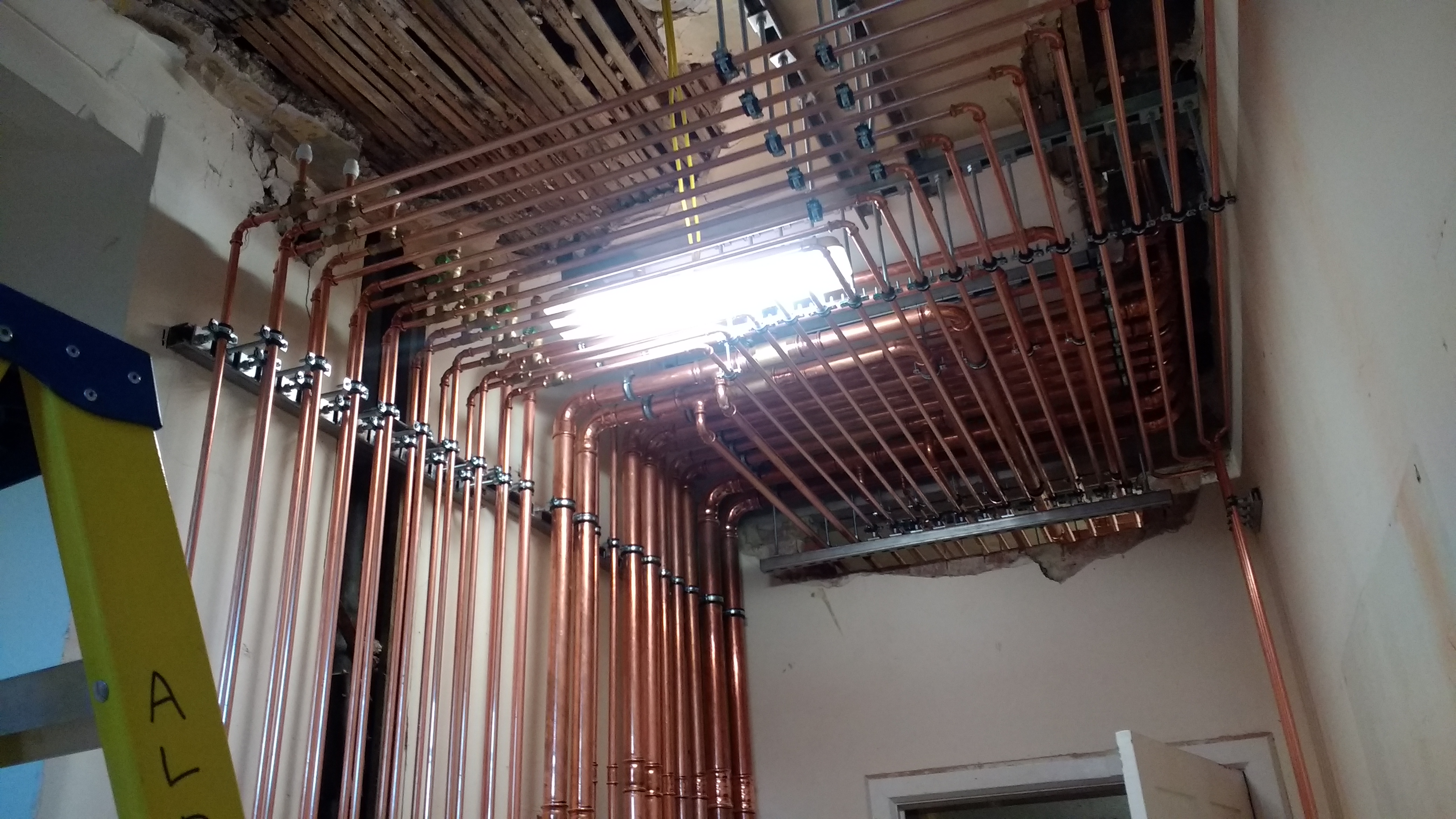 Heating system for an extremely large house, was originally about 35 bedrooms, will compromise of 12 suites when finished. That is the pipework rising from the cellar where the boiler will be situated. All pipework will be chased into walls. You should see the wiring, cat 6, cat 7, alarms, plus mains cables it looks nightmarish.