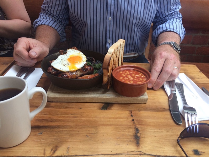 Eating a hipster breakfast served in a frying pan atop a block of wood. It even had pesto in it.