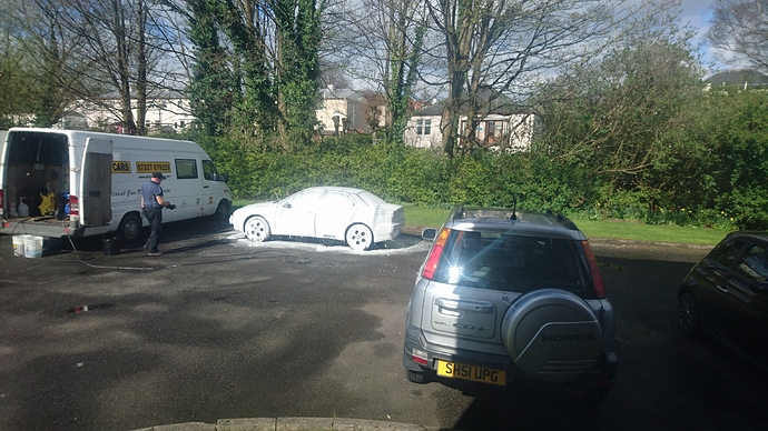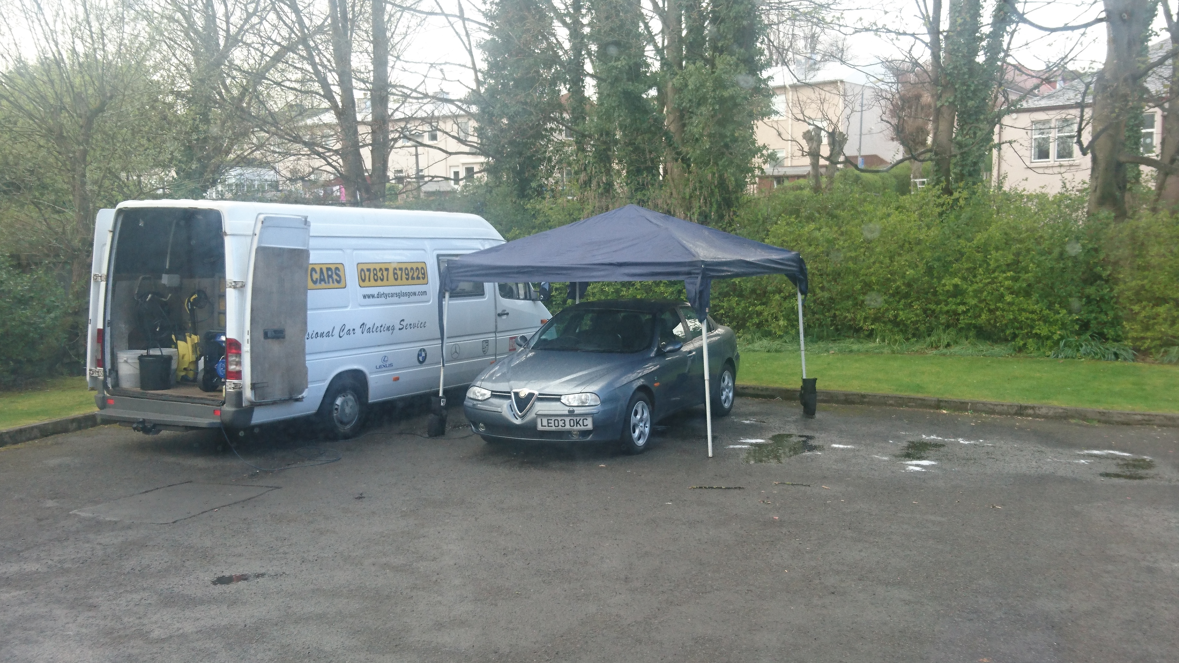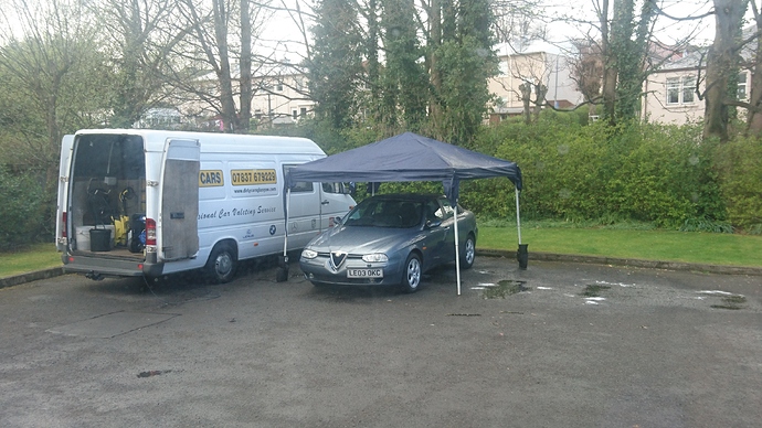 This guy’s a pro. Firstly, before machine polishing, he used some gizmo to measure the thickness of the paint. Then a rain shower passed over so out comes the gazebo. Impressive.