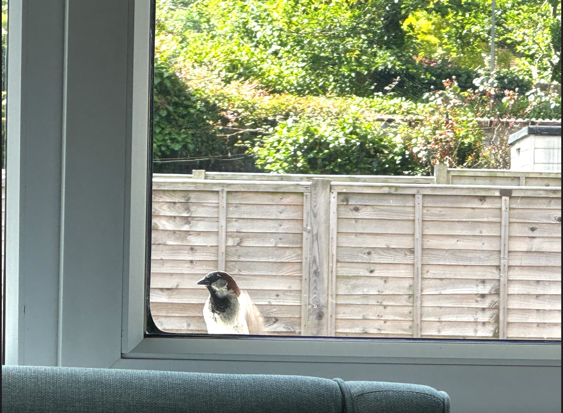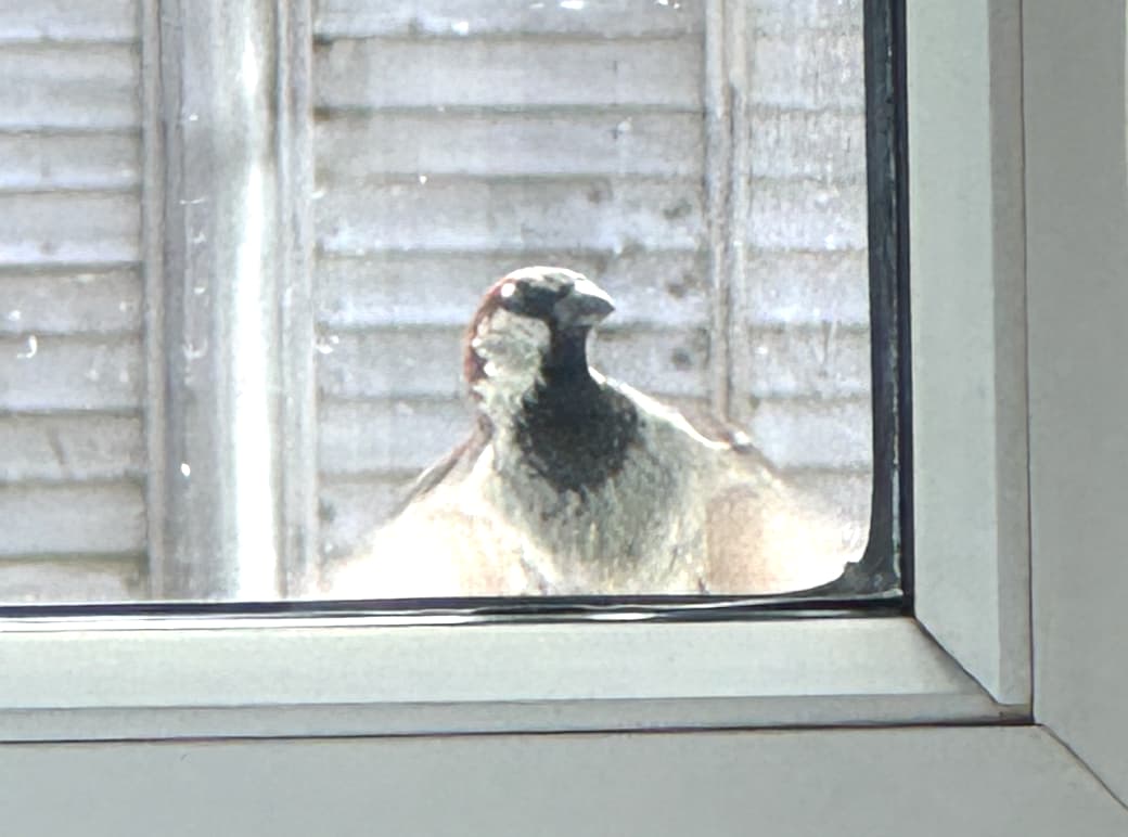Have what I think is a pair of house sparrows nesting under the porch tiles but one of them keeps sitting on the window ledge or hovering in front of the window.