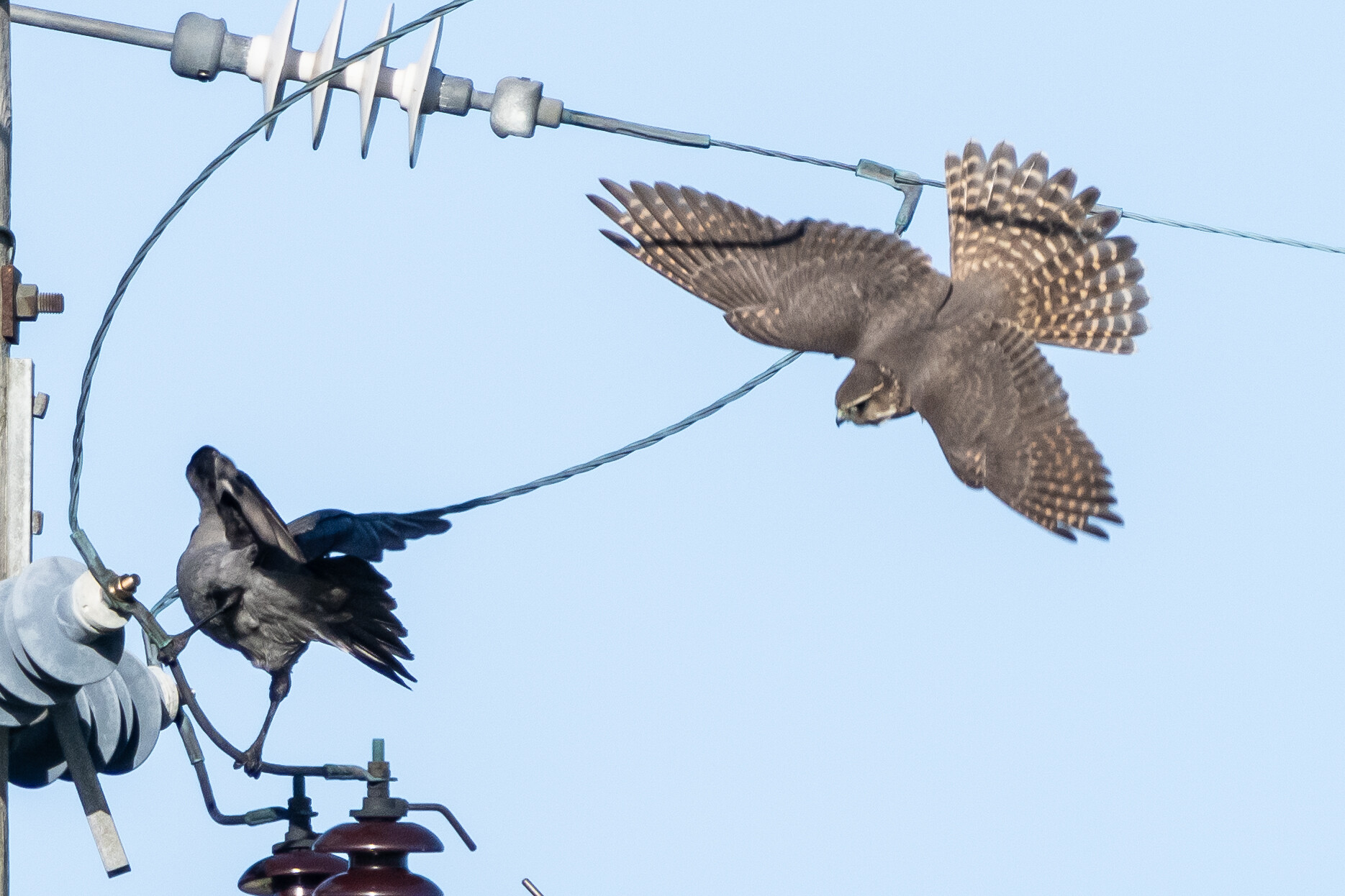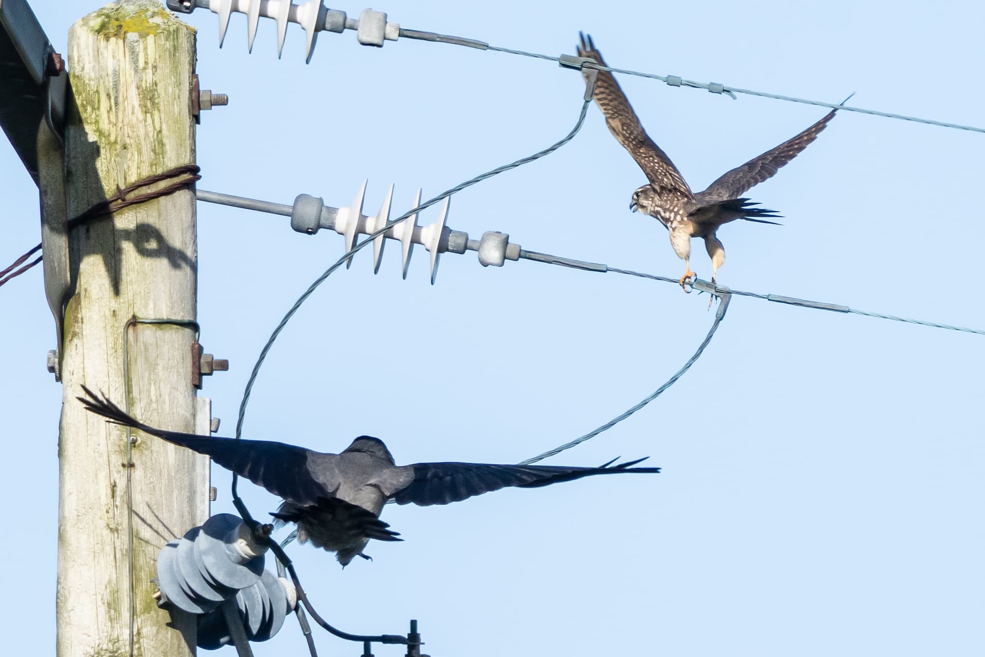 A Merlin perched on a wire at Baelens surveying its territory was unexpectedly attacked by a Hooded Crow.