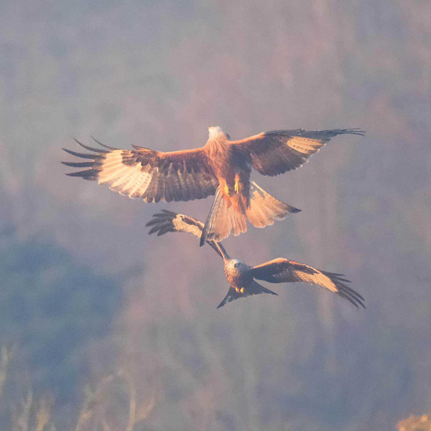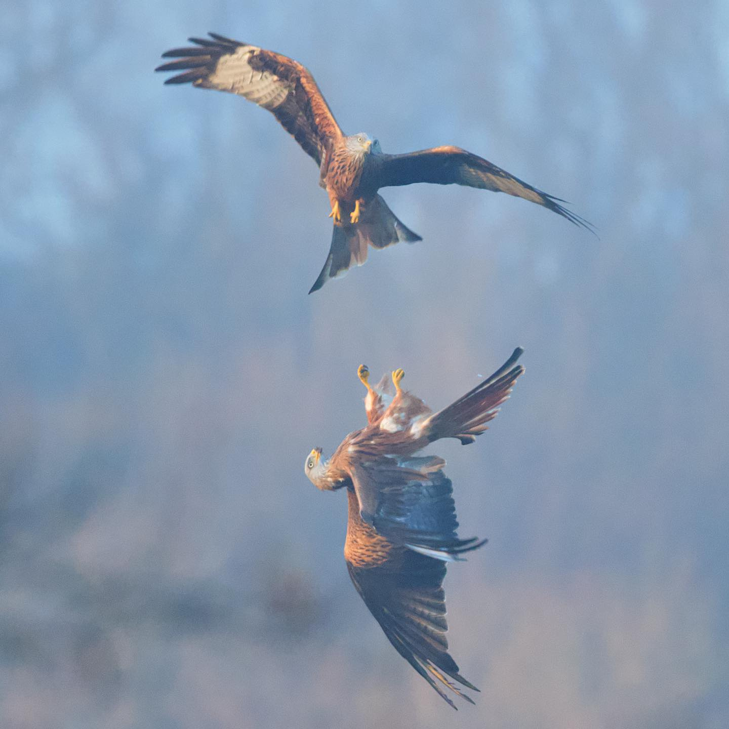 Aerial displays, locking talons, passing food in the air (male to female) and coordinated flying are well known examples of courtship between red kites.