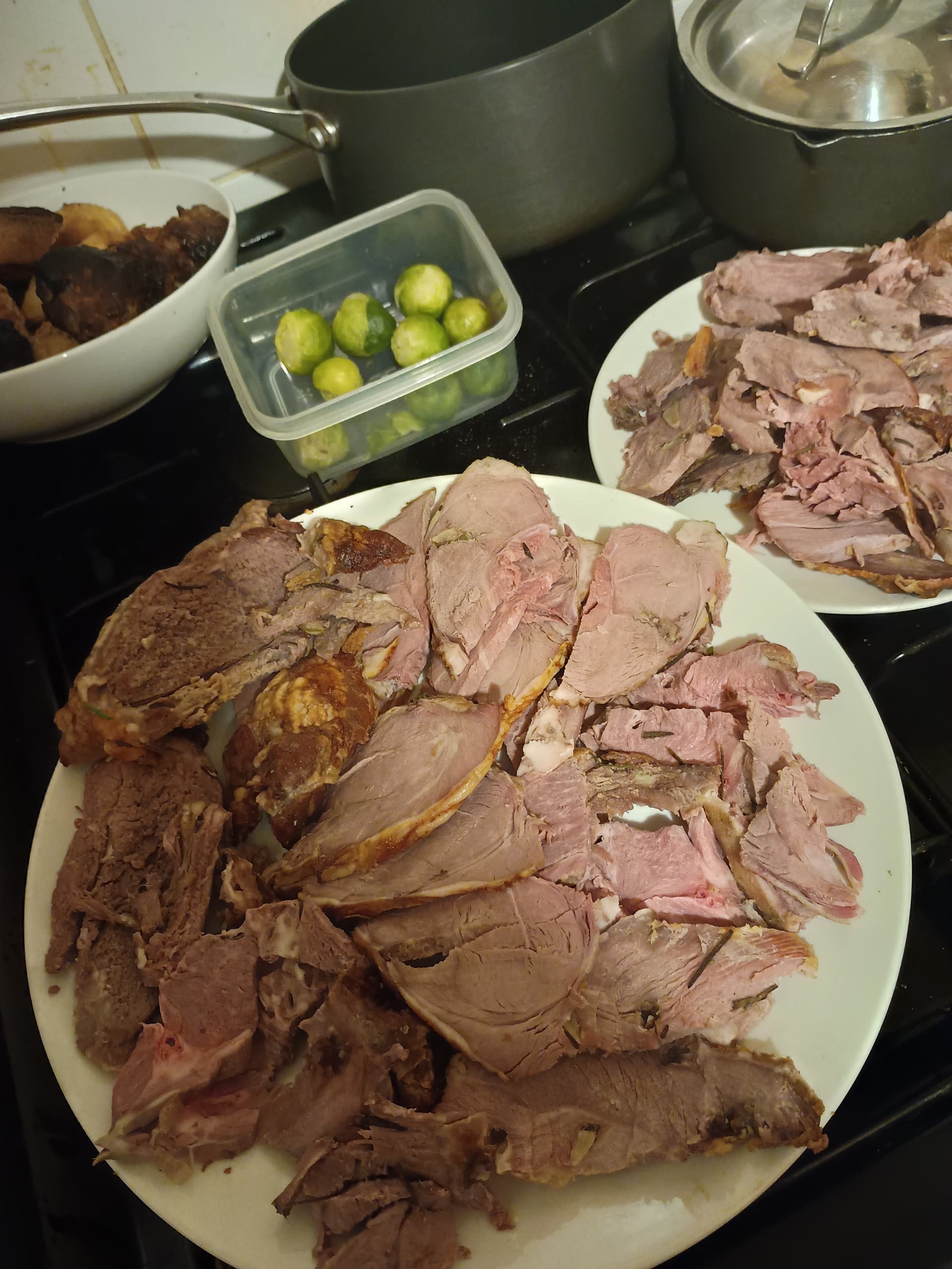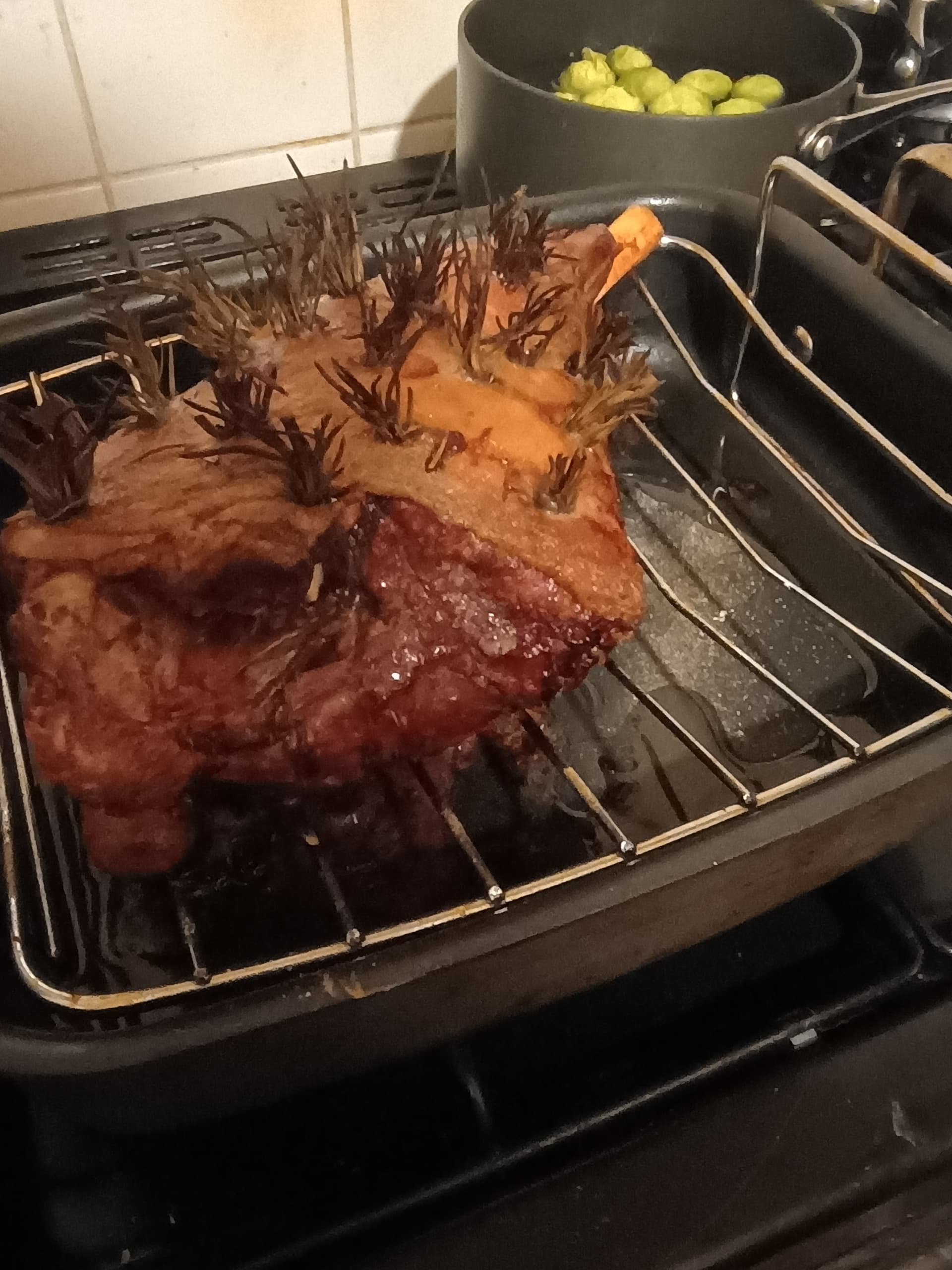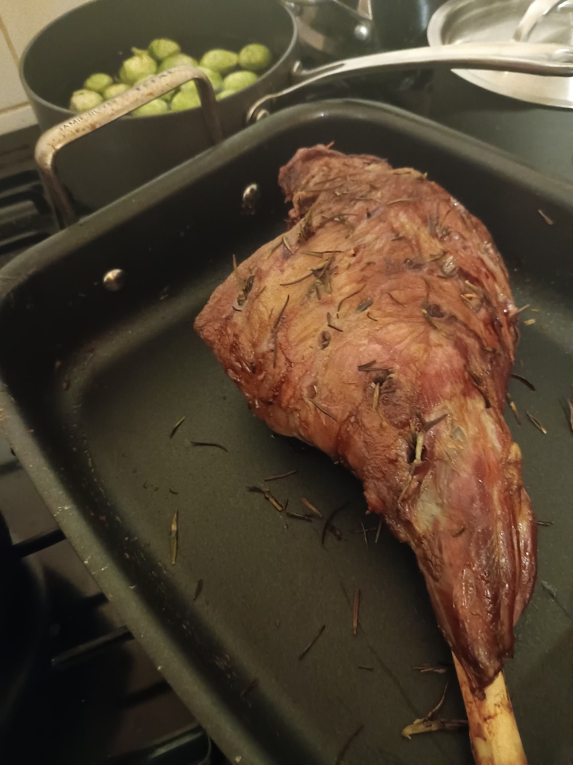 Lamb finished roasting, now resting with lid on roasting tin to preserve heat. Gravy done with meat juices, lamb stock & Tawny Port. Spuds around half hr from being ready, stuffing balls in oven & just the sprouts to go on & reheat of the Yorkshire puds.