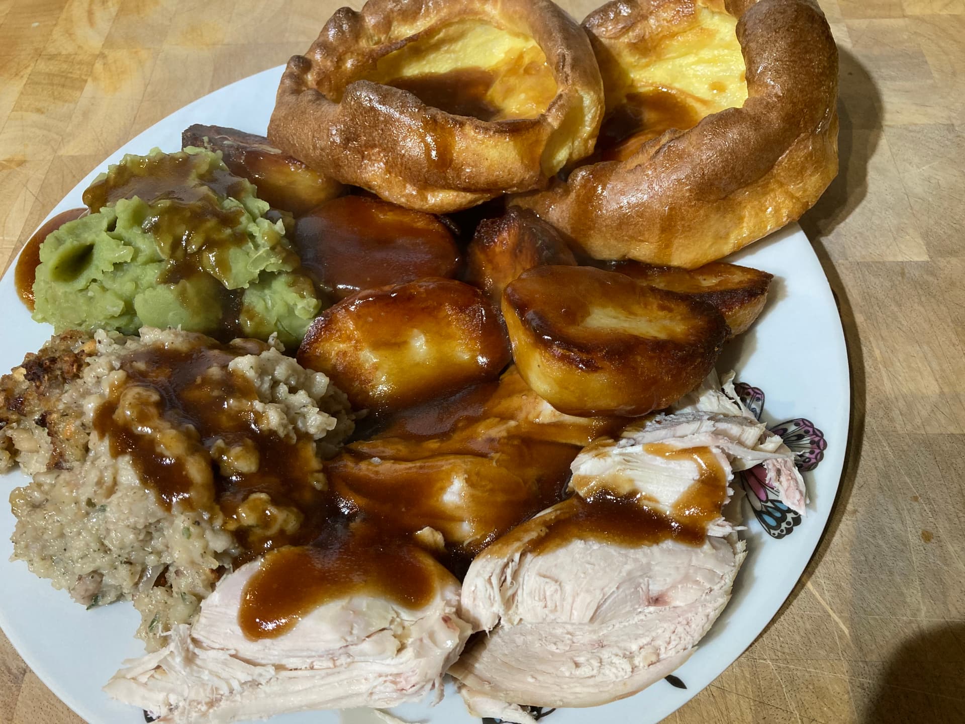 Finally sat down to dinner at 6pm, nowt special just roast chicken and sausagemeat stuffing