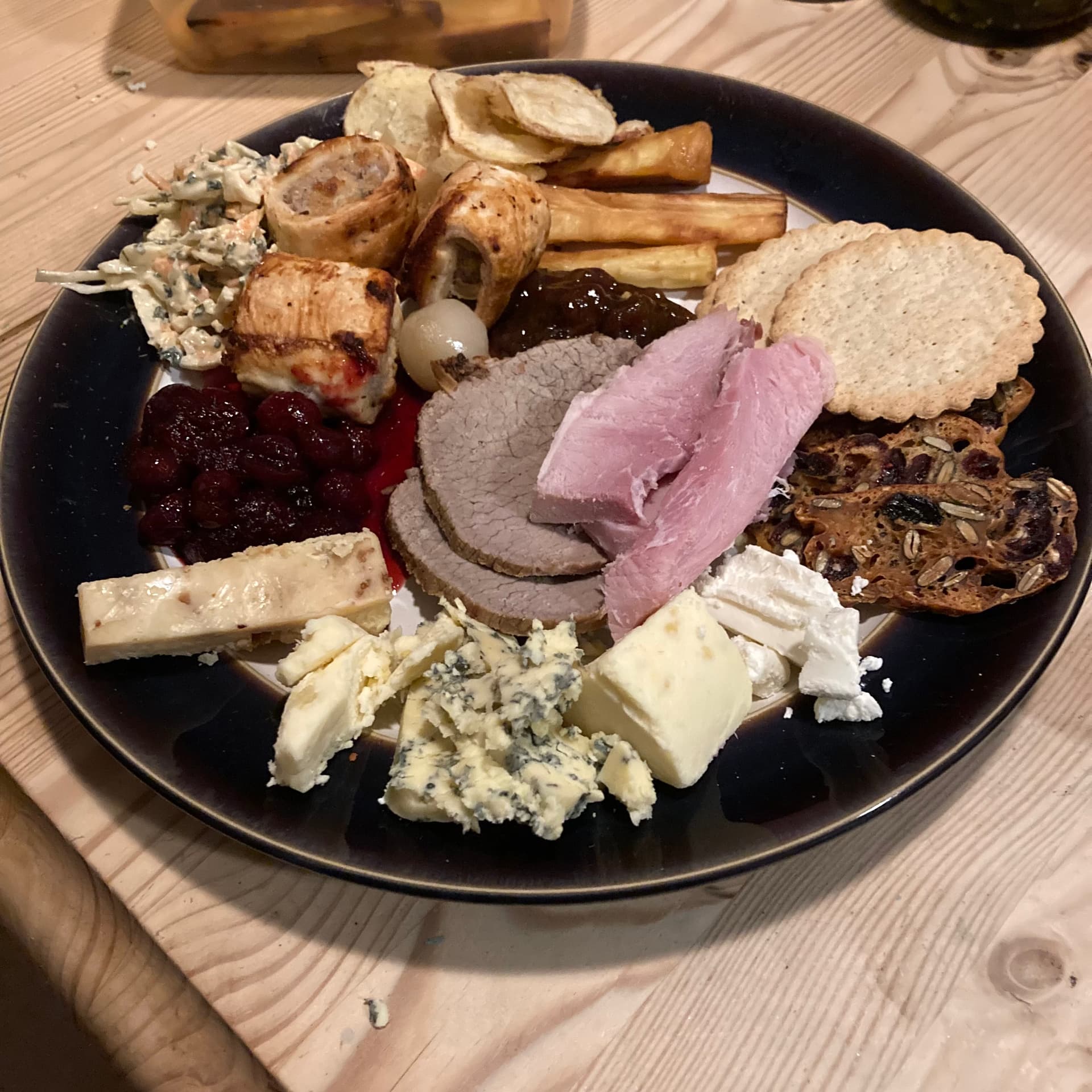 Roast leg of lamb with garlic & Rosemary, tatties & Echallion shallots roasted wiv garlic & Rosemary in duck fat & beef dripping, sosser meat bacon ‘n chestnut stuffing balls, sprouts & lamb stock & Tawny Port gravy with a Yorkshire pudding.