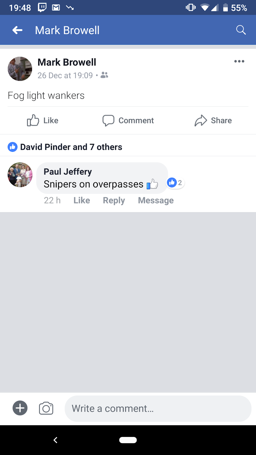 Bash to the groin region to the fuckers who think it is helpful to drive with their rear fog lights on, despite the only fog being the emissions from their exhaust - clear weather and I must have seen about a dozen foglight fuckers.